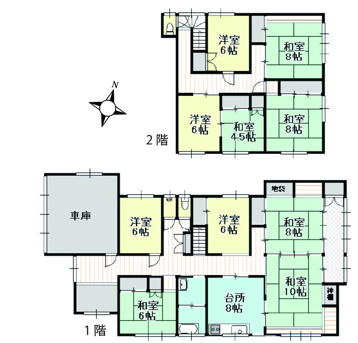 DK8畳 1階 和室6畳 1階 和室8畳 1階 和室10畳 1階 洋室6畳 1階 洋室6畳 1階 洋室6畳 2階 洋室6畳 2階 和室8畳 2階 和室8畳 2階 +車庫 |