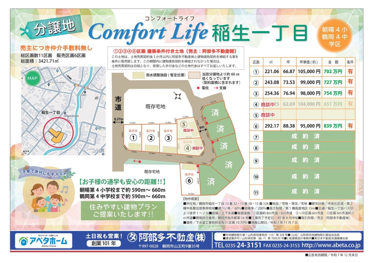 | 所在地 | 山形県鶴岡市稲生一丁目 コンフォートライフ稲生一丁目分譲地 |